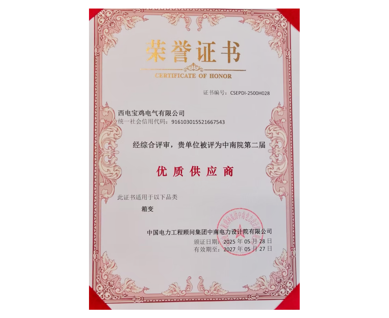 近日,西电宝鸡电气在中国电力工程顾问集团中南电力设计院有限公司(以下简称“中南院”)2025年度供应商大会上,凭借卓越的产品品质、高效的交付能力和优质的服务水平,连续第二年被授予“优质供应商”荣誉称号。这一殊荣的蝉联,不仅是对西电宝鸡电气多年来深耕行业、匠心服务的高度认可,更标志着双方合作迈入全新里程。
